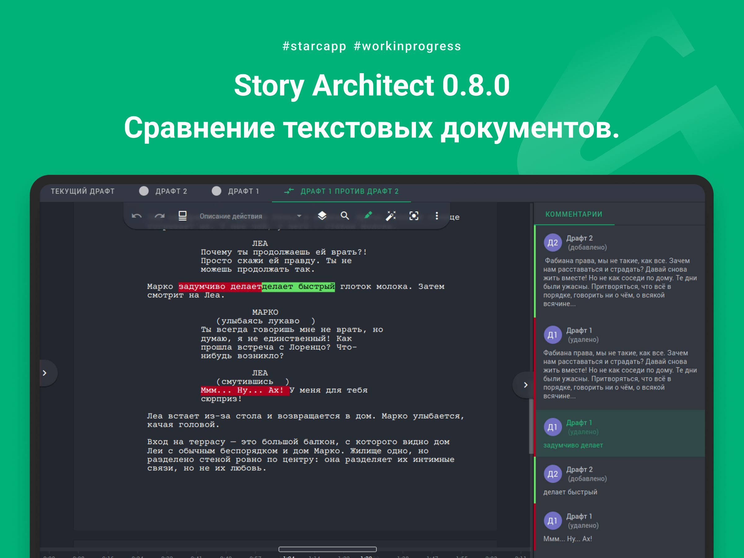 Сравнение доступно как для разных документов (для этого нужно выделить два сценария/текстовых документа/и т.п. и в контекстном меню выбрать пункт "Сравнить документы"), так и для драфтов внутри одного документа (для этого нужно кликнуть правой кнопкой мыши на панель со списком драфтов и выбрать пункт "Сравнить драфты").